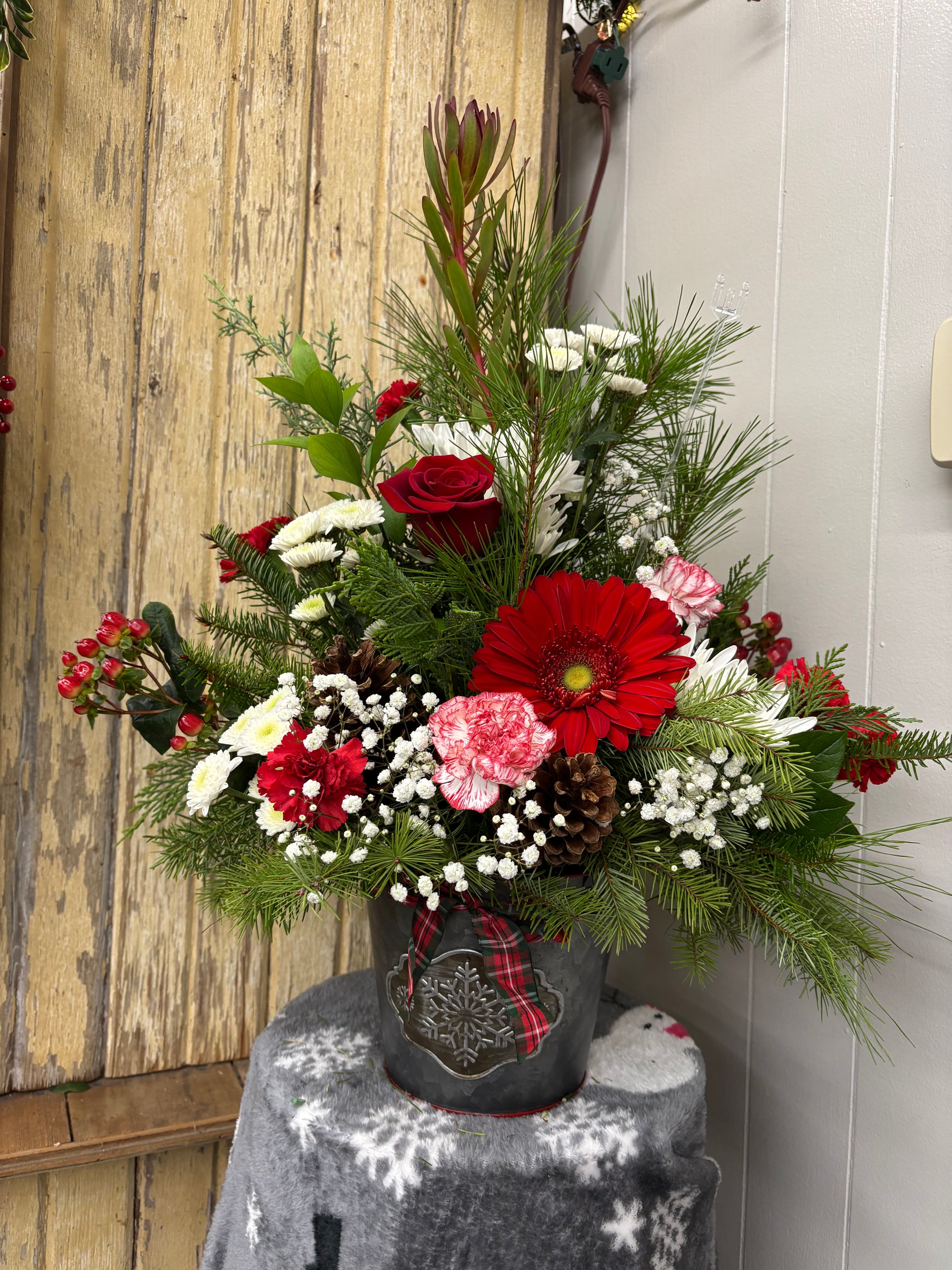 A PEWTER TIN WITH A SNOWFLAKE ON THE FRONT & PLAID RIBBON. WE HAVE FILLED IT WITH FRESH EVERGREENS & BEAUTIFUL RED & WHITE CHRISTMAS FLOWERS & ADDED BERRIES & CONES TO TOP OFF THIS JOYFUL ARRANGEMENT!