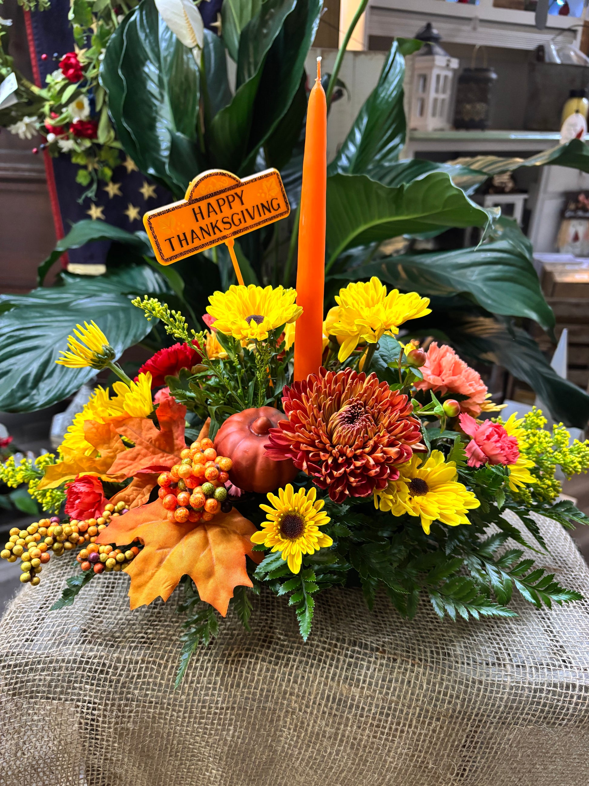 A single candle centerpiece with beautiful fall fresh flowers is a way to simply say thanks!